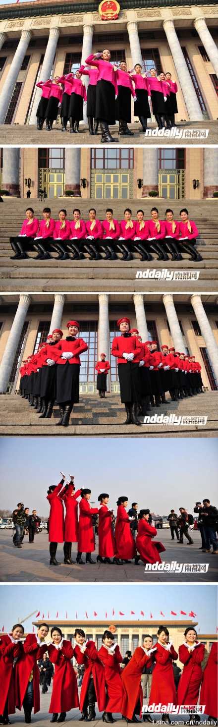 南都特派記者張志韜:代表委員駐地賓館,一群禮儀小姐在留影,一會兒排成“一”字,一會兒排成“A”字……