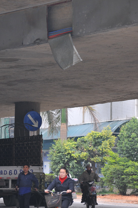 ?鴛江大橋東橋頭,橋下線槽的一塊鐵皮全部往外翻出,并有松脫跡象。據(jù)附近居民介紹,這塊鐵皮松脫外翻已有很長(zhǎng)一段時(shí)間了,希望有關(guān)部門盡早處理,以免鐵皮掉下傷及路人。 李鴻榮 攝