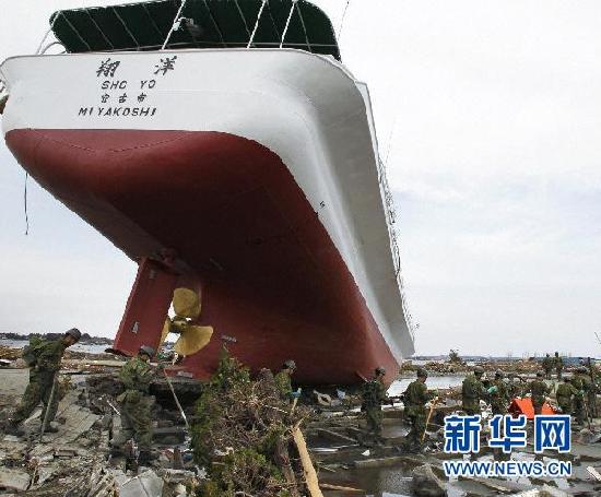 ??? 3月14日,在日本重災區宮城縣東松島市,日本自衛隊隊員經過一艘被海嘯卷起的大船。 新華社/共同社