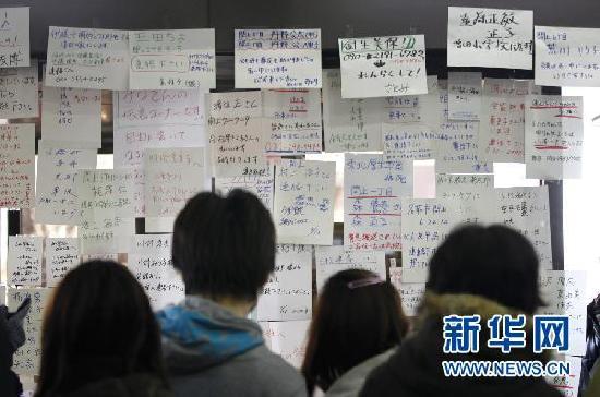 3月13日,在日本宮城縣仙臺市,人們在一個臨時信息中心的布告板上尋找親友的名字。 新華社/路透
