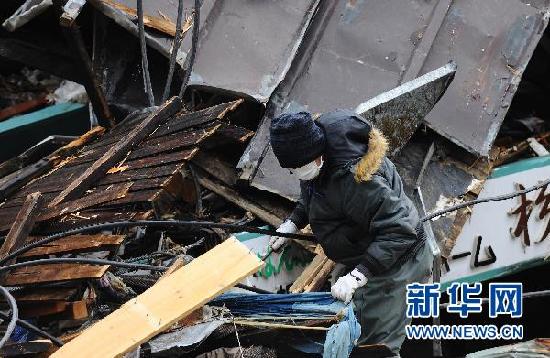 ??? 3月15日,在日本宮城縣女川町,一男子在廢墟中尋找妻子。當日,在日本宮城縣女川町一發電所的廢墟中,一名姓佐佐生的男子一點一點的挖著,希望能發現失蹤的妻子。 新華社記者 季春鵬 攝