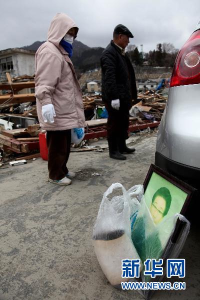 ??? 3月15日,災(zāi)民站在日本巖手縣大船渡市災(zāi)區(qū)廢墟前。 新華社記者 張金加 攝