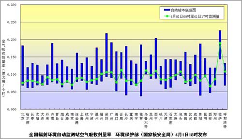 ????圖是環境保護部(國家核安全局)4月1日18:00繼續發布的全國省會城市和部分地級市輻射環境自動監測站實時連續空氣吸收劑量率監測值。監測結果匯總圖中綠色曲線代表監測值,藍色柱體代表天然本底水平,綠色曲線均在藍色柱體范圍內。(圖片來源:環境保護部網站)