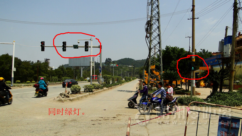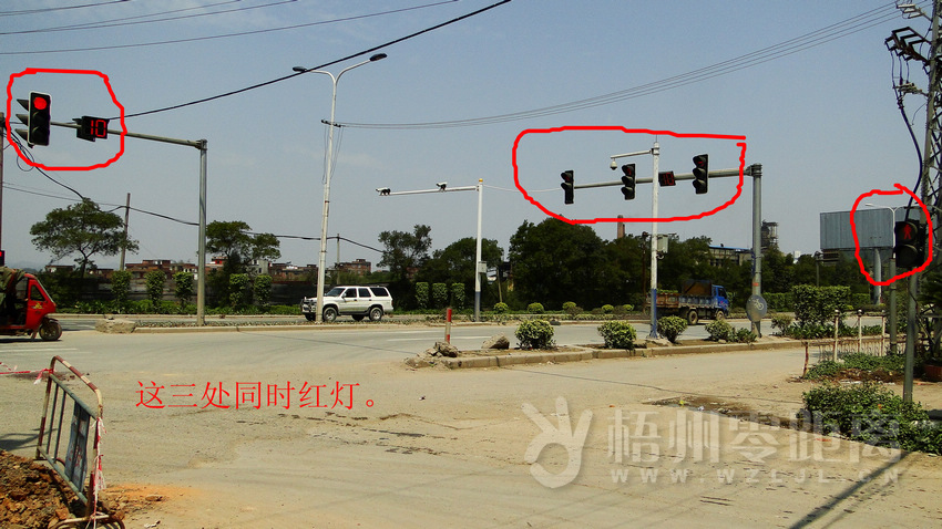 ?紅綠燈靠不住 人行與車行指示竟一樣 ?記者了解到,在龍圩往梧州方向轉入海龍城的車道,與此路口的人行道紅綠燈指示竟然是一致的。紅綠燈指示車輛允許轉左(即入海龍城)的同時,小路的人行道竟然是綠燈,而左轉紅燈時,小路的人行道也同時為紅燈,海龍城方向的車輛也禁止駛出。要么人與車同時等候,要么引車撞人,紅綠燈設置違背了道路交通安全、暢通的要求。