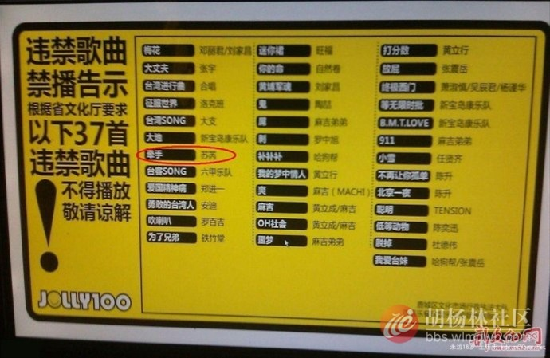 ????昨天中午,記者的手機收到一條消息:“反三俗,浙江省文化廳確定37首違禁歌曲,勁爆名單讓你大跌眼鏡!”記者立即上網查詢,搜索了百度、天涯等幾大網站,發現是一位網友,將他在溫州某KTV歌廳點歌臺的截圖,粘貼在貼吧里。其內容是:“違禁歌曲,禁播公示。根據省文化廳要求,以下37首違禁歌曲,不得播放,敬請諒解。”