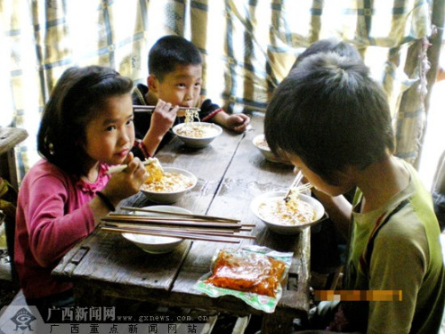????進山時,記者聽說山里沒有代銷店,村民吃鹽都要步行數(shù)小時出山購買。于是在九天小學旁的小商店,購買了10袋方便面和一些袋裝榨菜,一直沒派上用場。記者立即請韋老師去村民家要了點干柴,燒一大鍋水煮方便面。韋老師幾番推辭,表示孩子們“苦慣了,不礙事”。在記者的一再堅持下,留在學校的12個孩子才吃上一碗放有幾根榨菜煮的方便面。