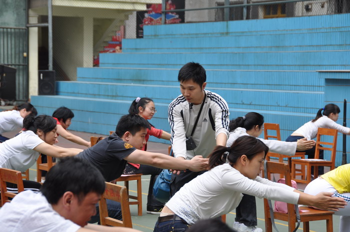 4月21日,健身操教練輔導學員正確進行訓練。黃能/攝