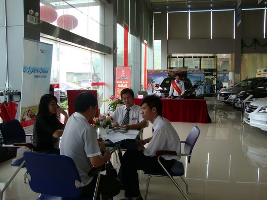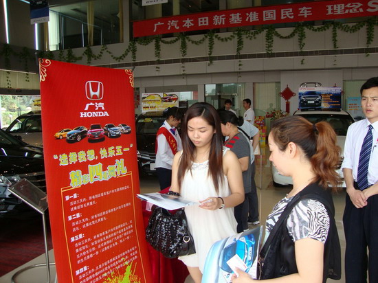 ? 2011年4月30日--5月2日,廣汽本田廣梧4S店在廣汽本田廣梧4S店舉辦 “選擇我想輕松購車 精彩五一四重賀禮”促銷活動,活動三天到場顧客90批,留檔顧客45批,訂車12臺。到場客戶均有“精美禮品”相送和購車送大禮優惠。