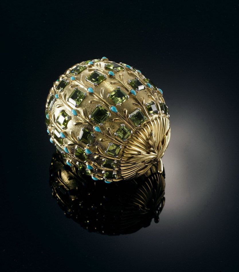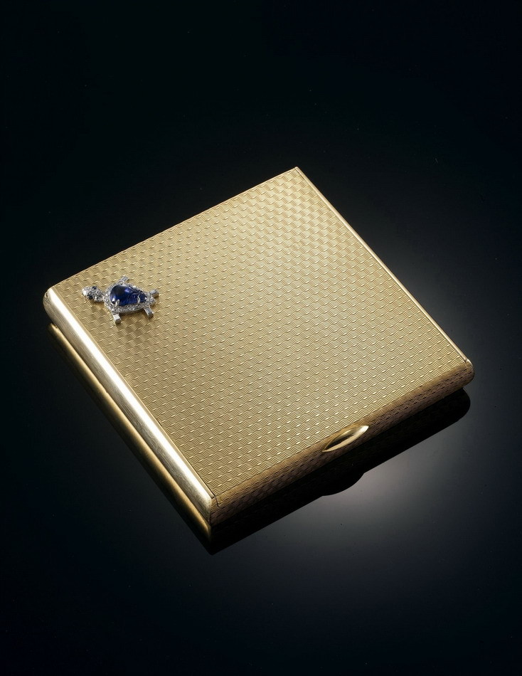??? 已找回展品——金嵌寶石龜化妝盒。 作者:卡地亞。材質(zhì):金,白金,藍(lán)寶石,鉆石(粉隔)。尺寸:7*7*1.2cm。時代:1950-1960年