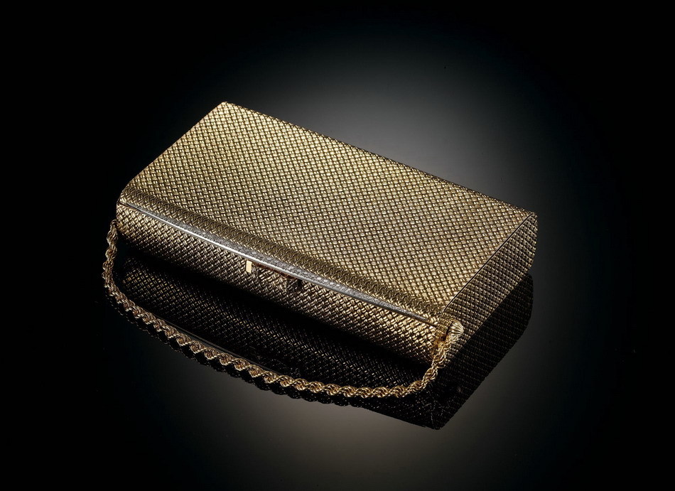 ??? 已找回展品——金鏨花嵌鉆石手袋。 作者:梵克雅寶。材質(zhì):金,白金,鉆石(金火機(jī)一個,皮套一個)。尺寸:15*8.8*3.2cm。時代:1950-1960年
