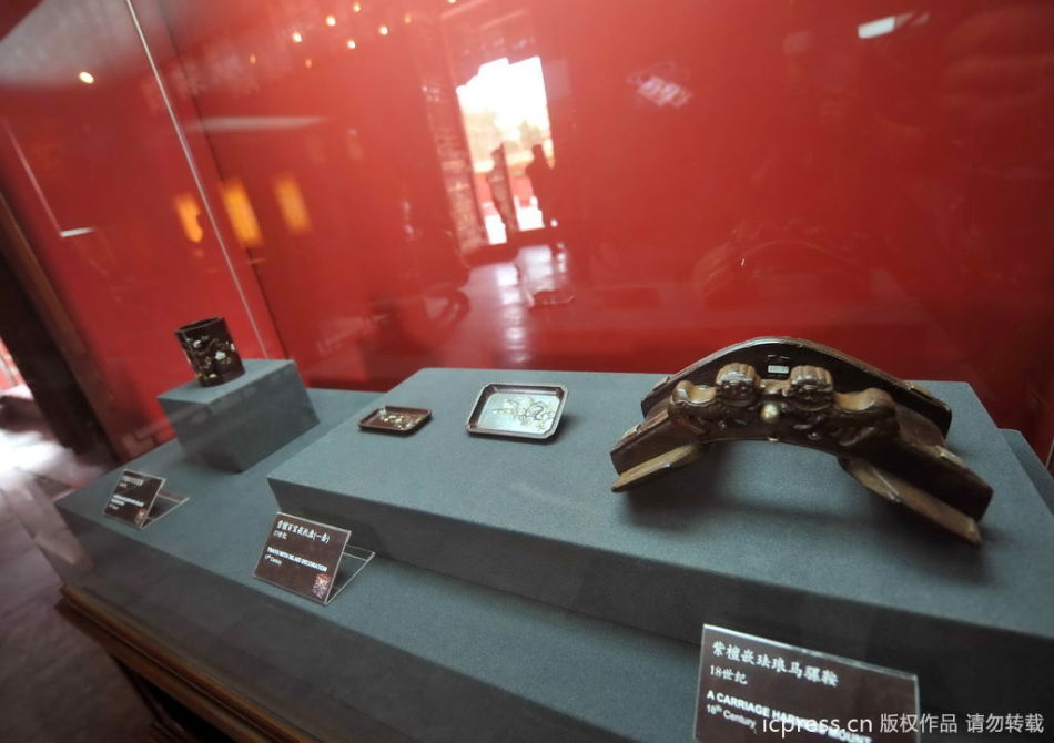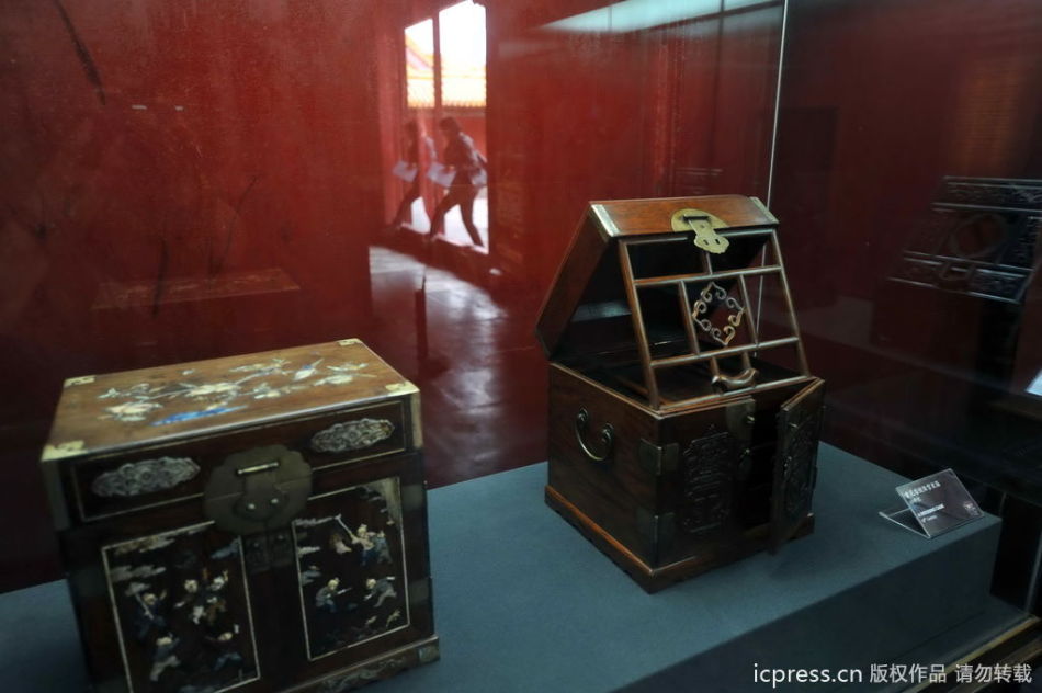 ??? 4月26日,北京,香港兩依藏博物館百余西式化妝盒藏品在故宮博物院齋宮開展,此為其在世界范圍內(nèi)首度集中亮相。圖為19件(套)明清紫檀、黃花梨家具,陳列齋宮正殿。