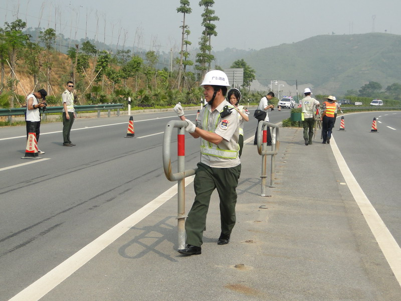 路政人員搬離通道活動(dòng)護(hù)欄進(jìn)行改道。