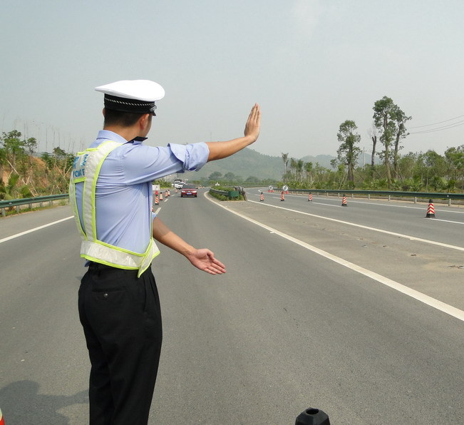 交警疏導交通,指揮過往車輛從改好的另一車道通過。