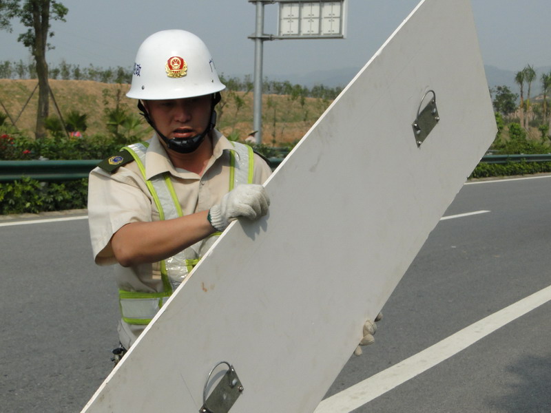 路政人員設置標志牌。