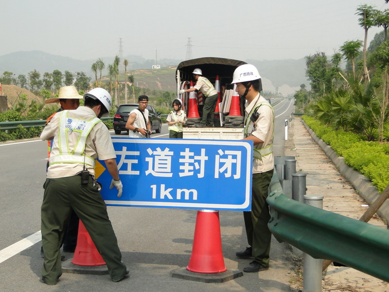 路政人員在右道設置標志牌提醒過往車輛左道已封閉。