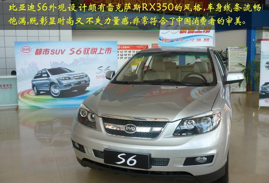 ????比亞迪S6外觀設計頗有雷克薩斯RX350的風格,車身線條流暢飽滿,既彰顯時尚又不失力量感,非常符合中國消費者的審美。比亞迪S6前臉非常厚實飽滿,前進氣格柵底部采用蜂窩狀設計,鑲嵌寬幅單條鍍鉻裝飾,配合比亞迪車標看上去比較醒目大氣。前大燈采用經典的晶鉆式設計,簡約不失動感,并且還有非常時尚的燈眉。三條肌力線在引擎蓋突起,給前臉增添了幾分力量感。