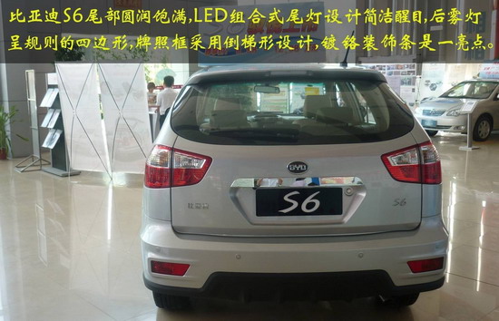 ????比亞迪S6的尾部造型圓潤飽滿。帶有LED高位剎車燈的尾翼自車頂向外延伸,更顯動感。LED組合式尾燈設計簡潔醒目,后霧燈呈規則的四邊形,能起到很好的警示效果。牌照框采用倒梯形設計,上部的鍍鉻裝飾條是一亮點。