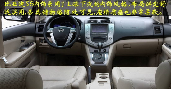 ??? S6中控臺采用了盾形設計,控制按鈕分布合理,操作簡便。上部配置了高位多功能顯示屏,多種行車信息一目了然。中控臺中央是7英寸顯示觸摸屏,集成了比亞迪自主開發的語音導航系統、移動數字電視等科技配置。作為比亞迪汽車精心打造的一款拳頭產品,S6充分展現了比亞迪過硬的技術實力和品質管理水平,相信上市后勢必將掀起一股搶購熱潮。