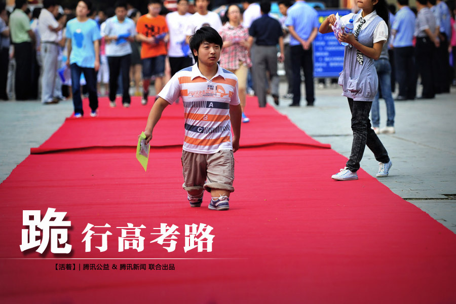 ????2011年6月7日上午8時30分,陜西漢陰縣中學考點,一位只有1.2米高的殘疾考生踏著紅毯,昂首“跪行”進入考場。他叫李衛,穿著鞋子卻沒有腳,憑著我們難以想象的毅力,一步步“跪”上高考的圣壇。鄧小衛 圖/文