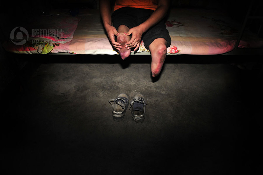 ? ? 小李衛(wèi)上學后,有一次逢農忙搶收,父母實在沒時間接送他,當時10歲的李衛(wèi)很倔強,硬是從家里爬到了學校,近千米的路途,他爬了一個多小時。后來,李衛(wèi)看到母親的膠鞋結實,試著將僅剩的一截小腿塞進去,用鞋帶綁在大腿上,就這樣開始了跪行求學之路。為了練習跪著走路,李衛(wèi)兩個膝蓋上的皮不知磨掉了多少層,十多年來小傷口不斷,無論寒暑冬夏,兩個膝蓋還有小腿都是紅腫的。