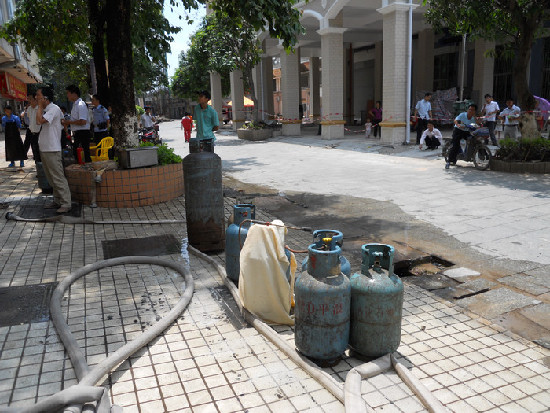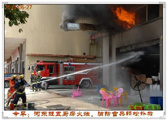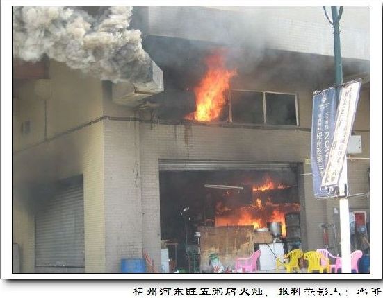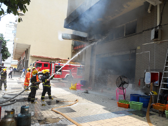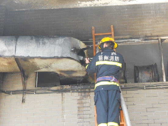當天上午11時10分,梧州市公安消防支隊接到群眾報警電話稱:梧州市萬秀區西江路旺五飯店廚房發生火災,現場濃煙滾滾;情況非常緊急,接到報警后,市消防支隊立即調動河東消防中隊兩輛水罐消防車、10名官兵趕赴現場撲救火災。在趕往現場的路上,消防官兵遠遠就看到現場的上空滾滾的濃煙漂浮在空中,到達現場后,消防官兵發現,現場被大火與濃煙充滿了整個廚房,隨時有向上蔓延的可能,廚房門口外面堆放著幾個煤氣罐;據現場知情人員了解,火災發生后,在廚房工作的人員第一時間把廚房內的6個煤氣罐搬出來,但是不知里面是否還有煤氣罐,現場情況非常緊急,指揮員立刻下令展開滅火戰斗,幾分鐘后,大火得到有效的控制,經過偵查沒有發現廚房內部還有其他的煤氣罐。
