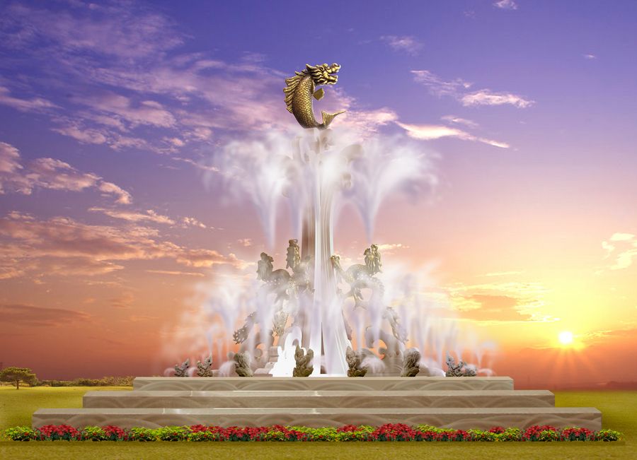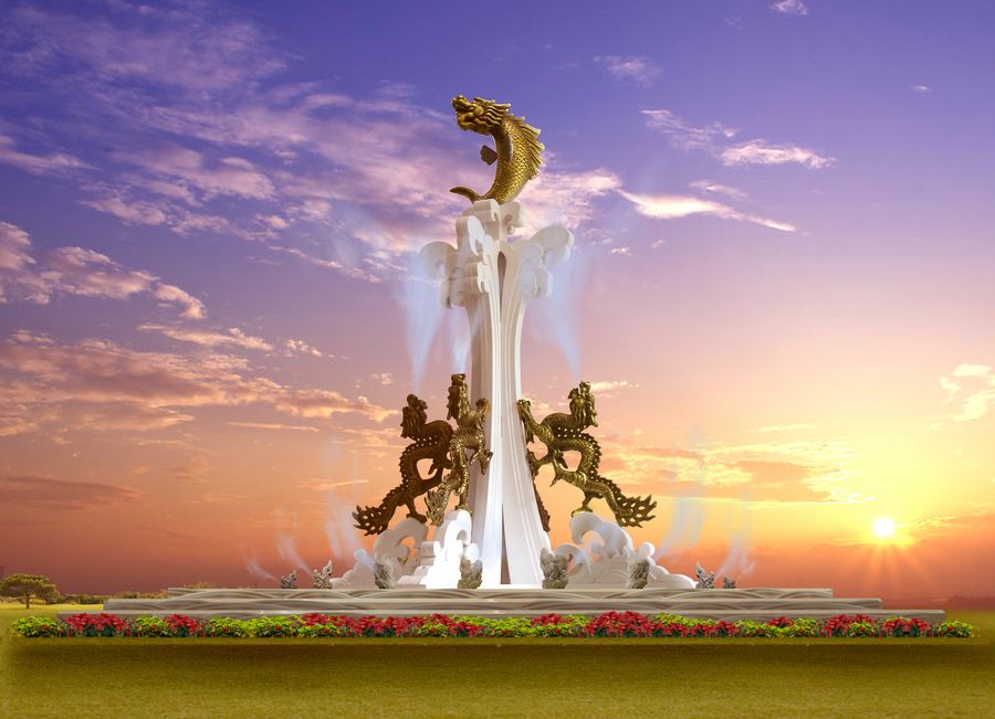 昂揚的龍魚象征著奮進的狀態,求變的精神,高遠的志向,與梧州人厚積薄發、寧靜致遠的城市性格吻合,同時也和梧州朝氣蓬勃、欣欣向榮的城市面貌相匹配。而下部四條已經完成蛻變的小龍,正昂首凝視,鼎力托舉,似乎正為最后一條小龍實現蛻變而吶喊助威,加油鼓勁,這與梧州人求和諧、講團結的人文精神相契合。而連接龍魚和四條小龍的水柱和浪花,也暗合了梧州本地“水為財”的民俗文化內涵。
