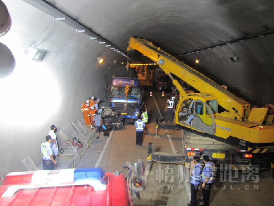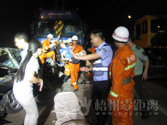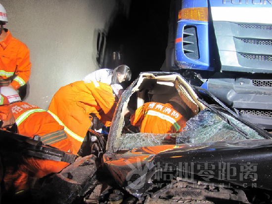 當日上午,南梧高速路南寧往梧州方向位于岑溪市與容縣交界處的蘭沖隧道內,發生一起大貨車追尾小轎車的交通事故,事故造成一名女子被困小車內。10時15分,岑溪消防大隊接到報警后,迅速出動一輛搶險救援車和8名官兵趕往事發現場。10時52分,消防官兵到達現場,只見在距離隧道口約100米處一輛車牌號為粵L71787小轎車被一輛車牌為贛CD701掛的大貨車壓住,一名女子被困小轎車內。事故點后面的車輛排起了長龍,南寧往梧州方向的車道已被交警臨時管制,禁止通行。