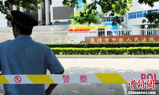 ????7月25日上午,河南焦作安保人員在法庭外執勤。當日, 河南第一批兩起“瘦肉精”案件將在河南焦作市中級人民法院和沁陽市法院同時開庭審理。中新社發 王中舉 攝