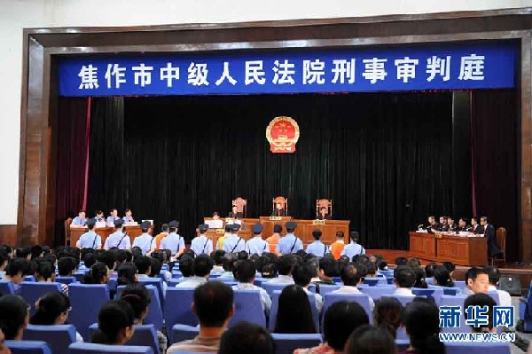 ????這是7月25日拍攝的焦作市中級人民法院庭審現(xiàn)場。當(dāng)日,備受社會各界關(guān)注的兩起“瘦肉精”案件開庭審理。其中,劉襄等5名生產(chǎn)者或一級經(jīng)銷商被起訴的罪名是“以危險方法危害公共安全罪”,焦作市中級人民法院組成由刑事審判第二庭庭長申兵任審判長的合議庭;王二團(tuán)等3名涉案國家工作人員被起訴的罪名是“玩忽職守罪”,沁陽市法院組成以專職審委會委員張文啟任審判長的合議庭。新華社記者朱祥攝