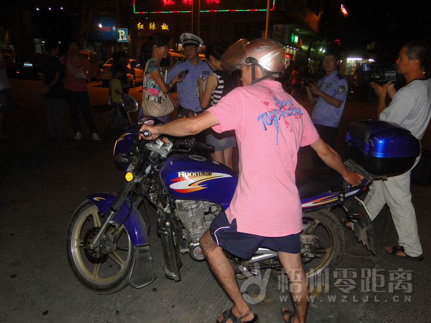 8月4日晚,我市交警部門在夢之島對出道路設卡檢查。不戴頭盔的摩托車駕駛者接受交警教育后表示悔改,戴上頭盔駕車離去。覃燕霞 攝