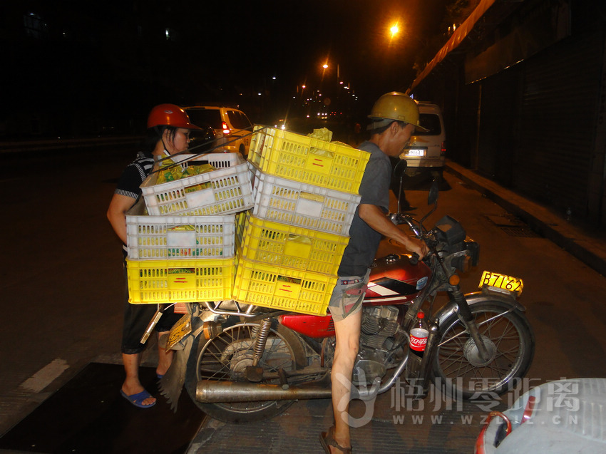 8月4日晚,我市交警部門在鴛江大橋西橋頭設卡檢查。一超載摩托車被攔下檢查。覃燕霞 攝