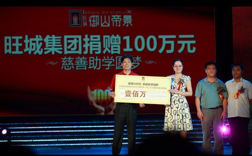 電子屏十秒倒計時之后,晚會在豪邁的鼓聲和炫麗的燈光中隆重開場。南方電視臺主持人曾文瀚和廣東電視臺女主持登臺亮相引歡呼。副市長劉詠梅和旺城集團的代表分別上臺發言致辭,劉副市長特別對旺城集團現場捐贈100萬慈善基金支持梧州市教育事業發展表示感謝。一段熱情洋溢的西班牙舞蹈之后,旺城集團“慈善助學圓夢”義捐儀式正式開始,旺城集團董事長在全場觀眾的見證下將壹佰萬元人民幣支票牌交到梧州市一中黨委書記劉敏紅和學生代表手上,捐贈的資金將用于幫助梧州一中貧困學生完成學業和獎勵優秀學子。