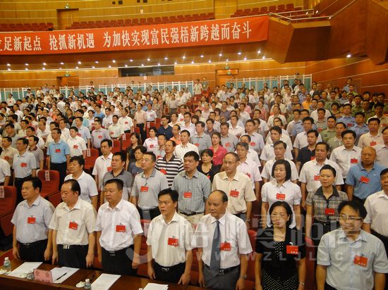 ????全體起立奏國歌。8月30日,梧州市第十二次黨代會開幕式在市文化展覽中心會場舉行。覃燕霞/攝
