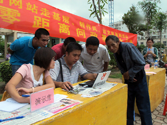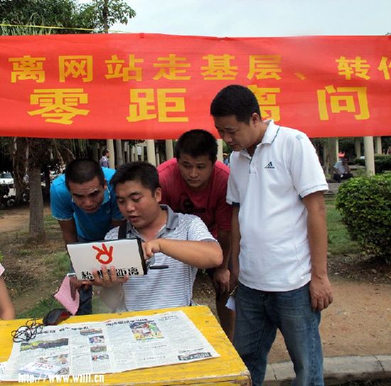 ????雨一停,蒼梧市民參與活動的熱情更為高漲了。三張記者報料席周圍很快便擠滿了前來咨詢的市民,辦事路過的、看了預告專程從村里趕來、報料的、聊家常的……一時間,場面異常火暴,尤其是零距離網站的發帖演示席,更是被十幾位初涉網絡的市民團團圍住。