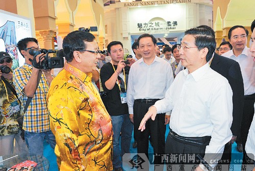 ????10月23日上午,自治區黨委書記、自治區人大常委會主任郭聲琨巡視了第八屆中國-東盟博覽會展館。在馬來西亞魅力之城——柔佛州展區。郭聲琨興致盎然地參觀欣賞,并與當地旅游局官員親切交流,祝愿他們在博覽會上取得豐碩成果。記者 劉宇 攝