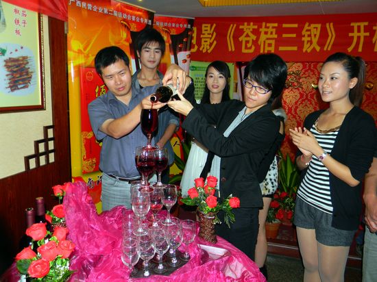 梧州首部微電影《蒼梧三釵》11月17日在迎煌酒店二樓舉行了開機儀式。《蒼梧三釵》出品人劉遠菁、編導陳遠良帶領7位主演出席,并為電影祝酒致辭。張苑 攝