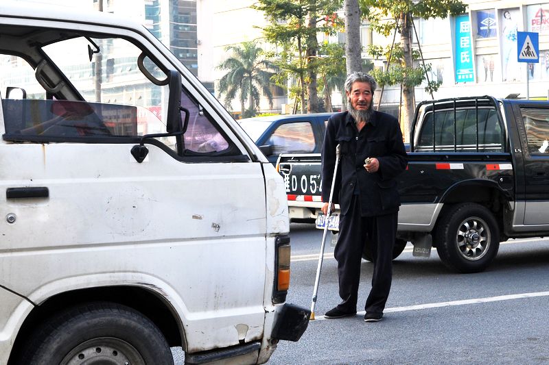 ?11月29日,一名杵拐杖的乞討人員在夢之島十字路口的車流中,向等待紅燈的司機乞討。據市民報料,近日有乞討人員不顧危險,冒險走進車流中向司機乞討,嚴重影響路面行車安全, 希望有關部門加以管理。 何鎏/攝