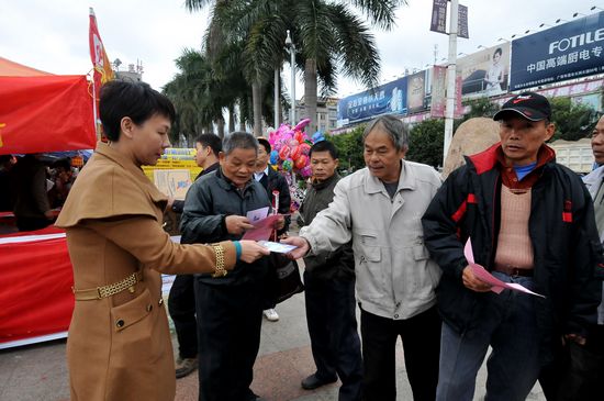 網(wǎng)站工作人員(右)現(xiàn)場(chǎng)向群眾發(fā)放網(wǎng)絡(luò)問政的宣傳資料。麥朝樞 攝