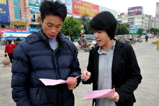 梧州報(bào)社工作人員(左一)在走訪現(xiàn)場(chǎng)向群眾發(fā)放宣傳資料。麥朝樞 攝