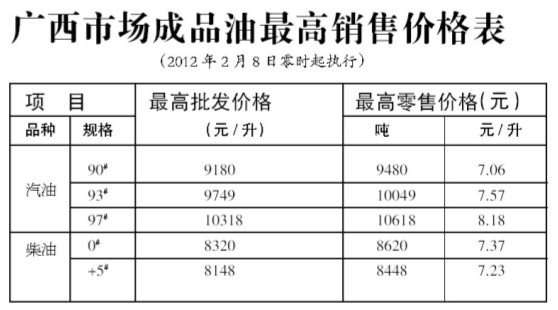 ????“此次調價,只能說是一次回彈。”據物價部門有關負責人介紹,廣西最近一次成品油價格調整是在去年10月9日,當時是自2010年6月1日以來成品油的首次降價,93#汽油每升售價下降了0.24元,由7.57元/升下降為7.33元/升;97#汽油每升售價下降了0.26元,由8.18元/降為7.92元/升。本次價格調整,93#汽油再次回調到了7.57元/升,97#汽油回調至8.18元/升。同時,此次調價,90#汽油每升上漲了0.22元,0#柴油每升上漲0.25元。