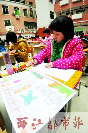 ??? 2月25日,參賽小選手們在賽后興奮地展示自己的作品。當天,“鴛江一都·百年梧州”梧州市第二屆手抄報比賽決賽在市中山小學舉行,430多名學生選手用畫筆描繪出自己心中美好的梧州。記者 蒙紹松/攝