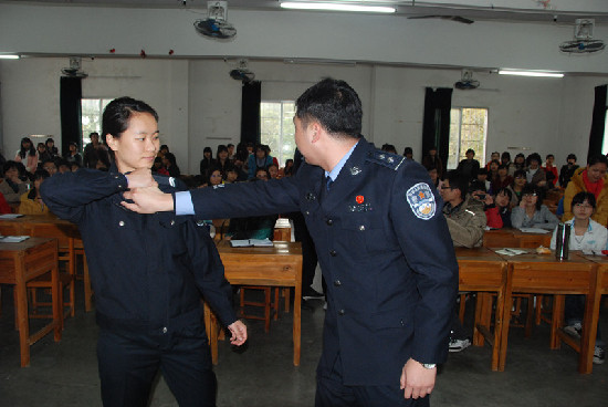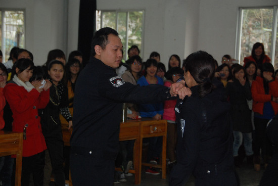 隨后,民警們還為同學們現場展示了擒拿格斗、解脫控制等基本的防衛技能,以精湛的技藝博得了現場同學的熱烈掌聲。賁鳴將動作要領向同學們逐一講解,并現場請學生們上前與民警共同練習,在輕松愉快的互動中提高同學們的安全防范意識。民警還發放了調查問卷和警民聯系卡,向同學們收集工作建議和意見。