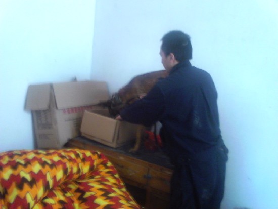了解情況后,黃劭遂攜帶警犬“萊恩”對民房進行搜查。當搜至二樓西南方向的房間時,警犬“萊恩”對堆放在墻角處的大量雜物表現興奮,黃劭同志將雜物攤開,讓警犬作進一步搜索。在對雜物進一步搜索中,警犬“萊恩”對一紙皮箱內的包裹變現異常興奮并示警。民警將包裹打開后發現一包疑似毒品海洛因的物質。隨后,黃劭同志攜帶警犬對該民房周邊路段和建筑進行搜索,當搜至民房西側的遺棄豬圈時,警犬“萊恩”順著豬圈低側爬上頂棚,并表現興奮后示警。民警遂爬上頂棚對警犬示警的一紅色布袋進行檢查,發現里面裹有大量疑似毒品海洛因的物質。