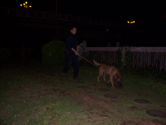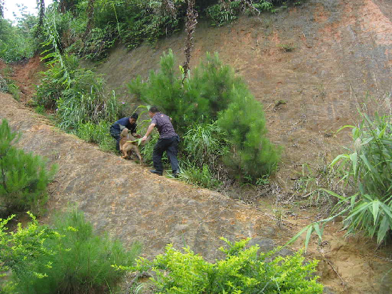 2011年11月某日晚上,位于轄區(qū)竹灣大道的某旅舍后背街道發(fā)生一起故意傷害致人重傷案件。接到警情后,黃劭同志帶上警犬萊恩趕至現(xiàn)場(chǎng)開(kāi)展搜索工作,在現(xiàn)場(chǎng)中心往南約250米時(shí),警犬萊恩發(fā)現(xiàn)數(shù)滴血跡,正確指明嫌疑人逃跑方向,民警據(jù)此迅速抓獲了嫌疑人。