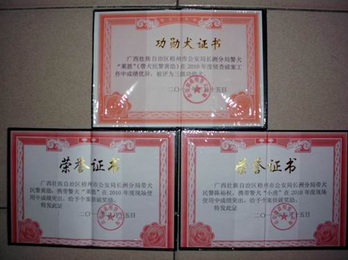 警犬技術(shù)工作是公安系統(tǒng)及邊防武警特有的進(jìn)行追蹤、鑒別、巡邏、伏擊、警戒、搜索、追捕、搜爆、緝毒的神秘武器,并在很多時(shí)候發(fā)揮著人及儀器所不能代替的作用。2011年,警犬“萊恩”被公安部昆明警犬基地授予“三級(jí)功勛犬”稱號(hào)。黃劭獲公安部授予“個(gè)案?jìng)善篇?jiǎng)”。黃劭和“萊恩“這對(duì)親密戰(zhàn)友一舉拿下兩個(gè)公安部的獎(jiǎng)項(xiàng),是公安部對(duì)他倆工作的充分肯定。