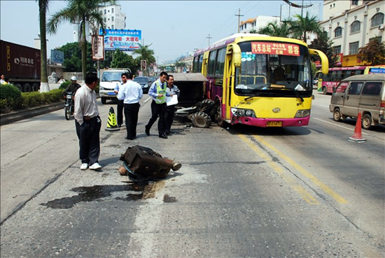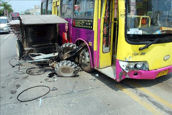 ??? 4月1日中午,岑溪市玉梧大道一中路口發(fā)生一起兩車相撞事故,兩車不同程度受損?,F(xiàn)場時看到,道路中間一輛拖拉機和一輛公共汽車的車頭撞在了一起,拖拉機的機頭還被撞飛在一邊,所幸事故沒有造成人員傷亡。