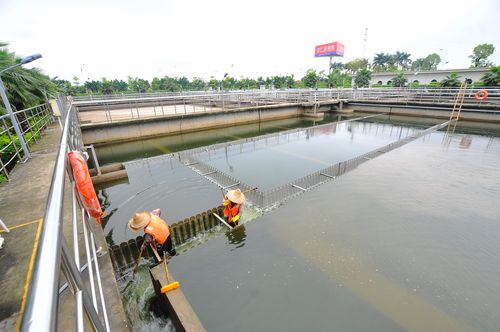 在市第一污水處理廠,工人們正在清理生化池。李鴻榮 攝