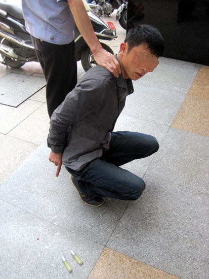 4月20日晚,紅樓派出所所長梁志成帶領民警在萬秀區西江二路某量販式KTV樓下對出路面伏擊守候。至21日凌晨,一名型跡可疑的男青年進入民警視線,只見該男青年在某量販式KTV樓下來回走動,觀察周圍,還不停打電話,一直沒有上KTV的跡象。多年辦案經驗告訴民警,這名男青年可能有問題。與此同時,伏擊民警又在附近發現另一名可疑男青年,該人神情緊張四處張望,還不時用手觸摸褲袋。梁志成果斷決定,馬上組織伏擊民警分別對兩名男子進行檢查、盤問。