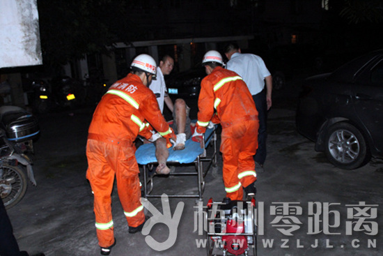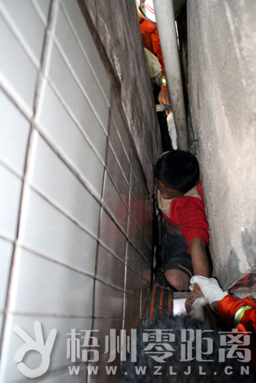 當晚22時08分,岑溪市消防大隊接到報警,稱岑溪市大中路9號有一男子被困墻縫中,接警后,消防官兵迅速出動。22時15分,救援人員趕到現場后發現,男子被夾在該建筑一樓至二樓之間樓梯轉角處的兩建筑連接處,經觀察,該墻縫寬度不足20厘米,在本來就狹小的墻縫里還依附著兩條下水管,致使男子身體絲毫不能動彈,此時受困男子已昏迷。消防官兵利用安全腰帶穿過受困男子大腿和臀部欲將其緩慢向上提起,但由于男子右腳順著排水孔伸出了墻體另一面,加之依附在墻體的水管阻礙,導致無法順利拉出。消防官兵只好將依附在墻體的水管折斷騰出空間,同時鉆到樓梯底下狹窄的下水道處,利用破拆工具將排水孔鑿開以擴大空間,使其右腳能順利拉出。23時20分,男子被救出,經醫護人員診斷,男子受輕微皮外傷,并無大礙。