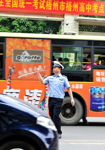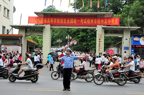 6月7日上午,梧州市公安局交警支隊(duì)在梧高考點(diǎn)疏導(dǎo)交通。石桂暉/攝 |